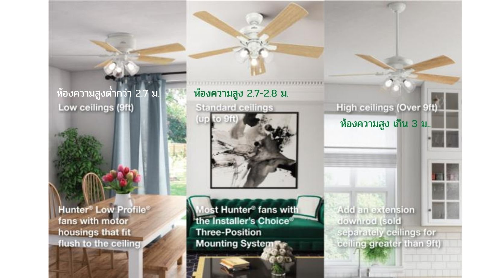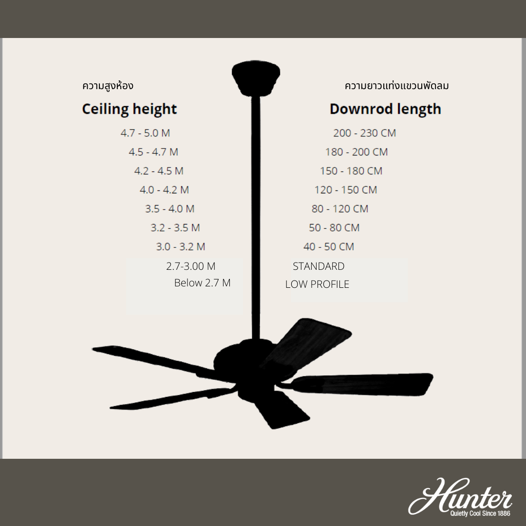 Low Profile เป็นพัดลมที่ Hunter Fan ออกแบบมาเฉพาะสำหรับห้องที่ความสูงของเพดานต่ำกว่า 2.7 เมตร