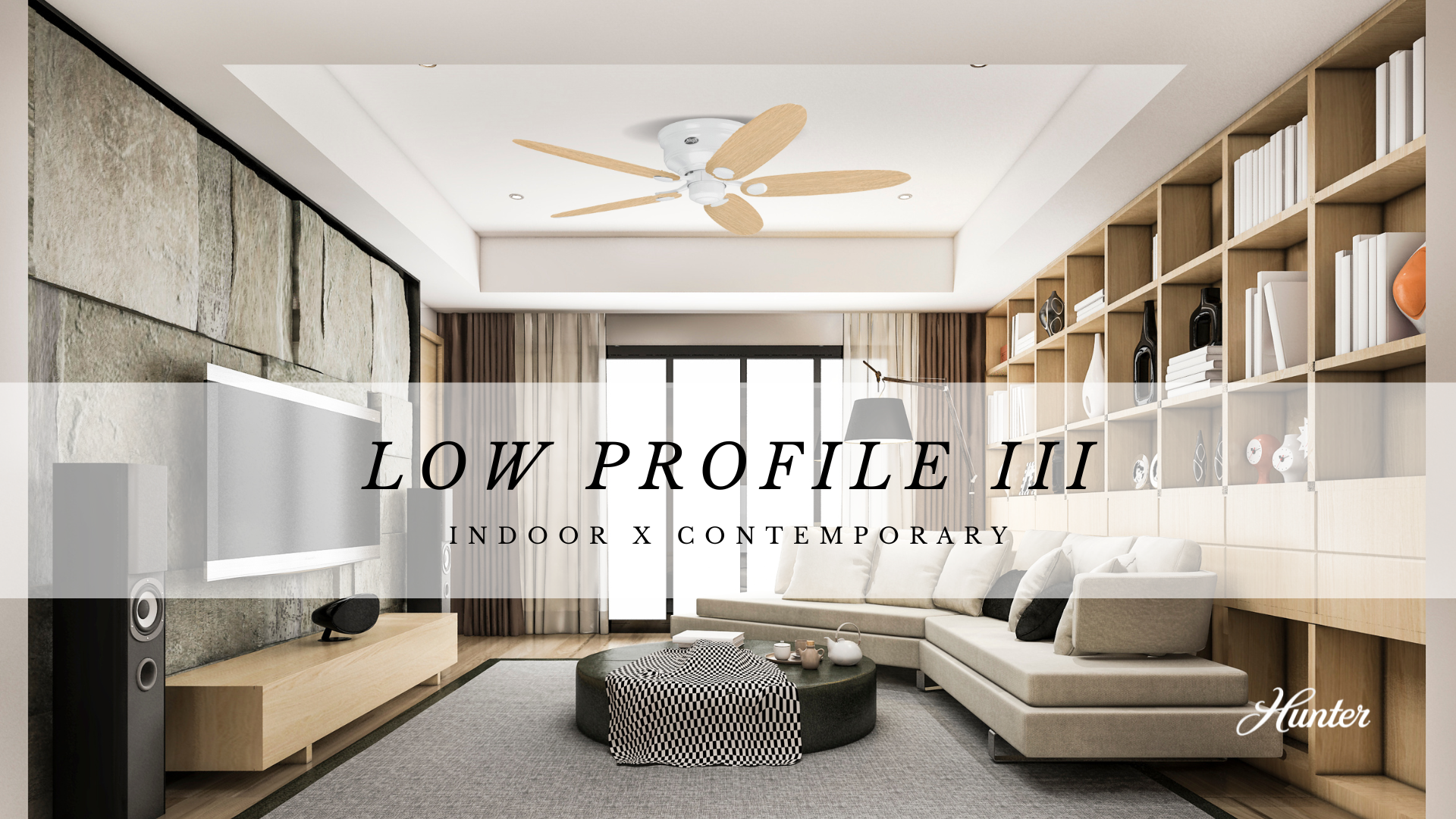 พัดลมเพดาน Hunter Fan รุ่น Low Profile III สี White ดีไซน์ Contemporary เป็นพัดลมเพดานประเภท Indoor 5 ใบพัด จุดเด่นของพัดลมเพดานรุ่นนี้คือสีของใบพัดที่มาให้เลือก 2 สี ได้แก่ สีขาวและสีน้ำตาลเมเปิล ซึ่งเป็นสีโทนอ่อนเข้ากับเฟอร์นิเจอร์ภายในบ้านได้ง่าย เหมาะกับการตกแต่งสไตล์มูจิ หรือ สแกนดิเนเวียน ที่สำคัญเป็นรุ่นที่ออกแบบมาพิเศษสำหรับห้องที่มีความสูงต่ำกว่า 2.6 เมตร ด้วยความสูงจากฐานพัดลมเพดานถึงใบพัดเพียง 19 ซม จึงทำให้ Low Profile สามารถติดตั้งในห้องที่เพดานไม่สูงมากได้ มีให้เลือก 2 ขนาด เส้นผ่านศูนย์กลางขณะพัดลมหมุน 132 เซนติเมตร หรือ 52 นิ้ว และ เส้นเส้นผ่านศูนย์กลางขณะพัดลมหมุน 122 เซนติเมตร หรือ 44 นิ้ว