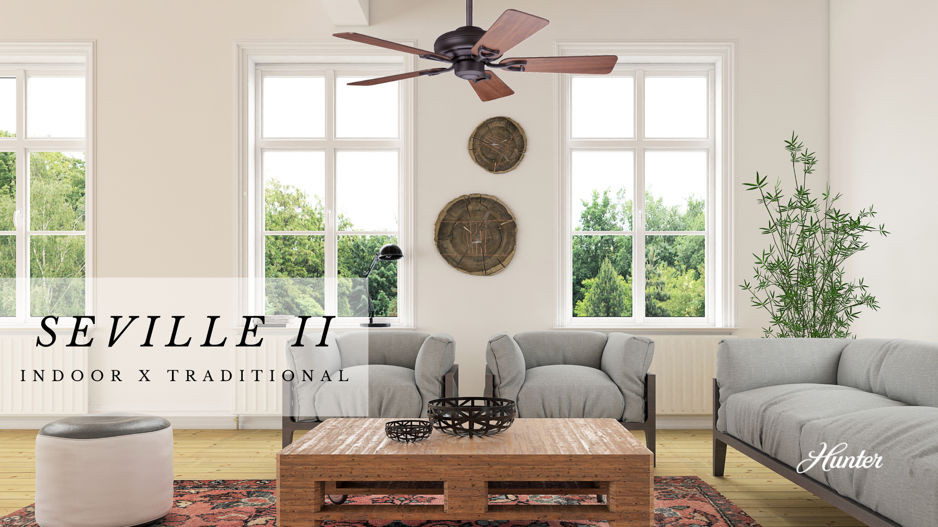 พัดลมเพดาน Hunter Fan รุ่น Seville II สี New Bronze ดีไซน์ Traditional เป็นพัดลมเพดานประเภท Indoor 5 ใบพัด Seville II เป็นพัดลมเพดานขนาดเล็ก เหมาะกับห้องที่มีขนาดไม่ใหญ่มาก ดีไซน์สวย Classic มีรายละเอียด ถึงแม้ Seville II จะเป็นพัดลมเพดานที่มีขนาดเล็ก แต่สามารถให้ลมแรงไม่แพ้รุ่นที่มีขนาดใหญ่หากติดตั้งในพื้นที่ที่มีขนาดเหมาะสมกับพัดลมเพดาน ขนาดเส้นผ่านศูนย์กลางขณะพัดลมหมุน 112 เซนติเมตร หรือ 44 นิ้ว