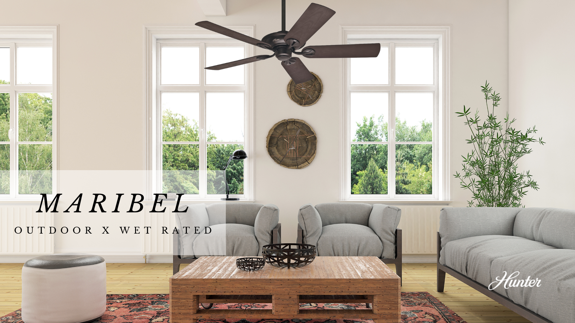 พัดลมเพดาน Hunter Fan รุ่น Maribel สี New Bronze เป็นพัดลมเพดานประเภท Outdoor 5 ใบพัด พัดลมเพดานรุ่น Maribel ถูกออกแบบมาเพื่อติดตั้งในพื้นที่นอกอาคารที่ไม่มีหลังคา สามารถกันน้ำได้ 100% ภายในตัวมอเตอร์มีการเคลือบสายไฟป้องกันความชื้น เคสมอเตอร์ผลิตจากอลูมิเนียมไม่มีปัญหาสนิม อุปกรณ์อื่นผลิตจากสแตนเลส เป็นพัดลมเพดานรุ่นที่คนนิยมซื้อไปติดในพื้นที่นั่งเล่นนอกบ้าน ให้ลมแรงเย็นสบาย การนั่งเล่นนอกบ้านจะไม่เป็นปัญหาอีกต่อไป ขนาด