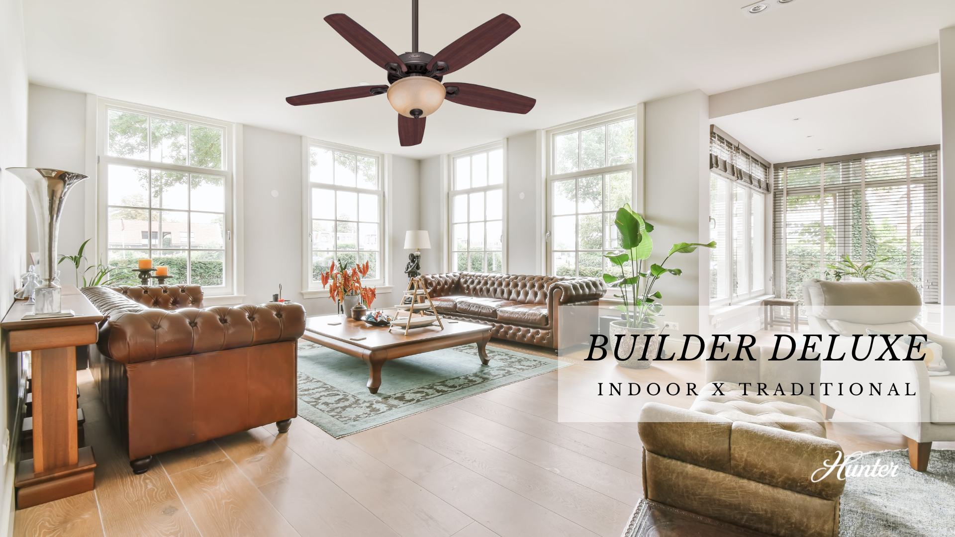 พัดลมเพดาน Hunter Fan รุ่น Builder Deluxe สี New Bronze ดีไซน์ Classic เป็นพัดลมเพดานประเภท Indoor 5 ใบพัด พัดลมเพดานรุ่นนี้มีเอกลักษณ์เฉพาะตัว ด้วยดีไซน์ Classic Luxury สไตล์ยุโรป มาพร้อมโคมไฟสีเหลืองนวลผสานกับสีใบพัดไม้ได้อย่างลงตัว ด้วยสีของไม้และดีไซน์ทำให้พัดลมเพดานเป็นรุ่นยอดนิยมอันดับ 3 เพราะเข้ากับการตกแต่งบ้านสไตล์คลาสิค ทั้งไทยและยุโรปได้เป็นอย่างดี ขนาดเส้นผ่านศูนย์กลางขณะพัดลมหมุน 132 เซนติเมตร หรือ 52 นิ้ว