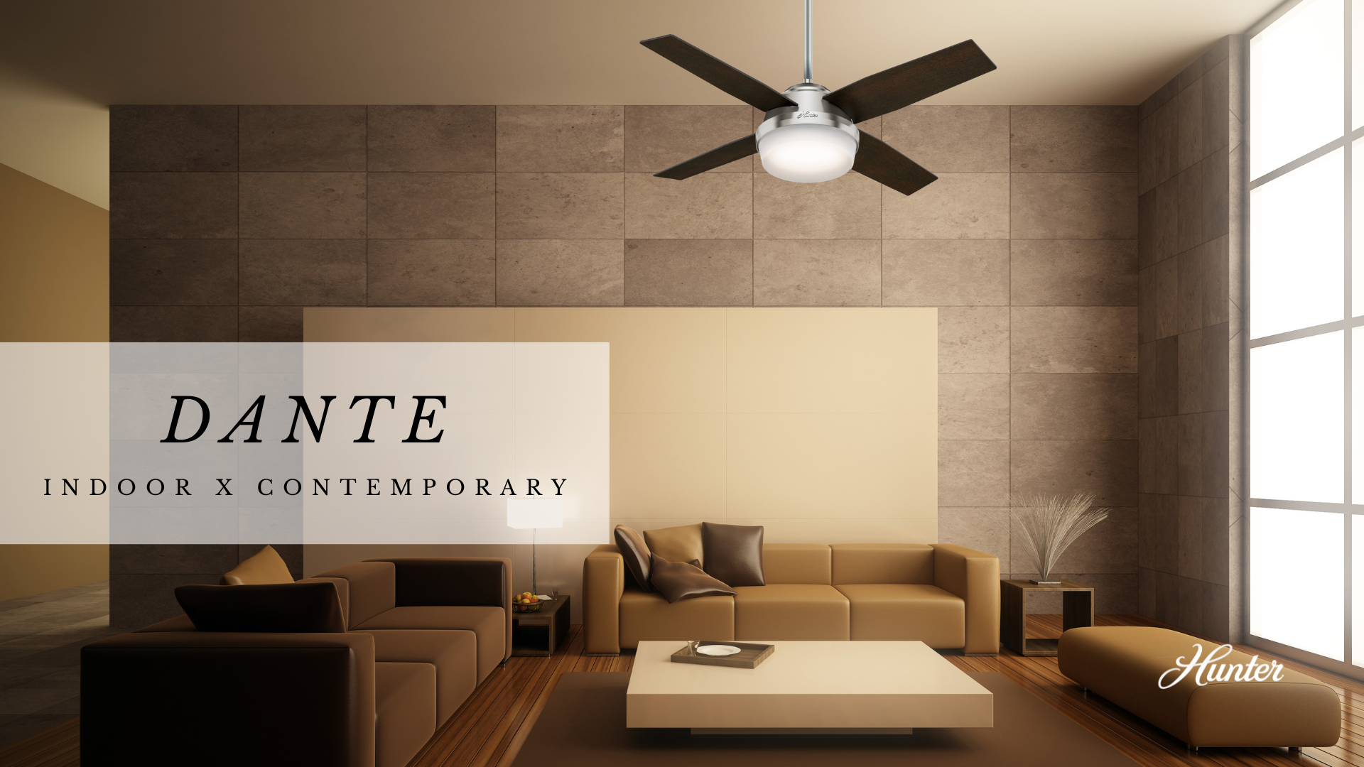 พัดลมเพดาน Hunter Fan รุ่น Dante สี Brushed Nickel ดีไซน์ Contemporary เป็นพัดลมเพดานประภท Indoor 4 ใบพัด Dante เป็นพัดลมเพดานอีกหนึ่งตัวที่มีขนาดเล็กติดตั้งสะดวก เหมาะกับห้องที่มีขนาดเล็ก มีดีไซน์สวยหรู รูปแบบผสมผสาน มาพร้อมกับโคมไฟขนาดใหญ่ เข้ากับบ้านได้หลากหลาย ในประเภทสี Brushed Nickel สามารถเลือกสีของใบพัดลายไม้ได้ 2 สี ได้แก่ สีน้ำตาลเข้มและสีดำ ขนาดเส้นผ่านศูนย์กลางขณะพัดลมหมุน 112 เซนติเมตร หรือ 44 นิ้ว
