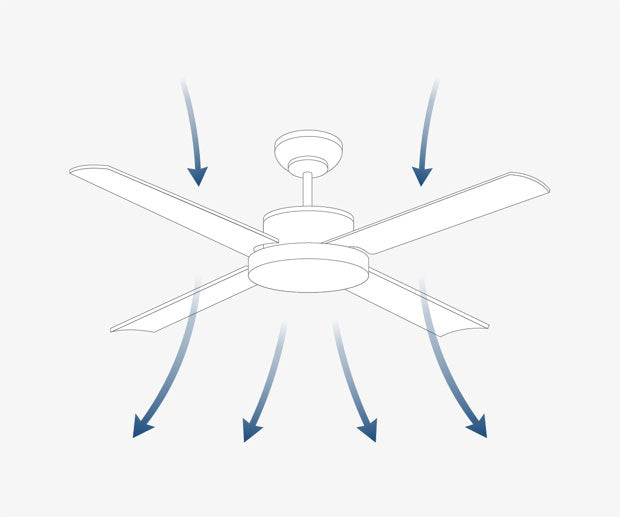 ฟังก์ชั่นการหมุนกลับของใบพัด การปรับใบพัดของพัดลมเพดานให้หมุนทวนเข็มนาฬิกาด้วยความเร็วต่ำ อากาศเย็นจะถูกดูดขึ้นด้านบนและอากาศอุ่นจะถูกดันลงด้านล่างและหมุนเวียนโดยไม่ทำให้เกิดความเย็น