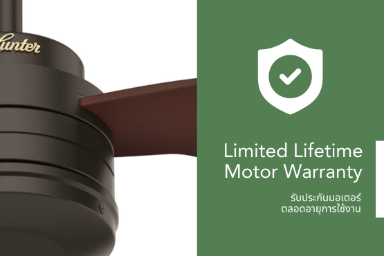 การรับประกันมอเตอร์ตลอดอายุการใช้งาน เป็นจุดเด่นที่โด่งดังของ Hunter Fan Company, Hunter Fan เป็นบริษัทเดียวที่มีอายุมากกว่า 130 ปีในธุรกิจพัดลม คุณจึงสามารถมั่นใจในประสบการณ์ของเรา